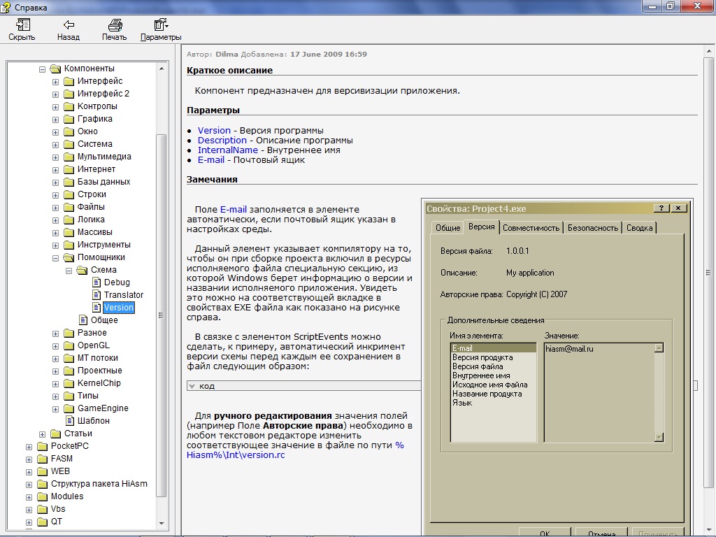 Установка на программу версии, автора и иконку
