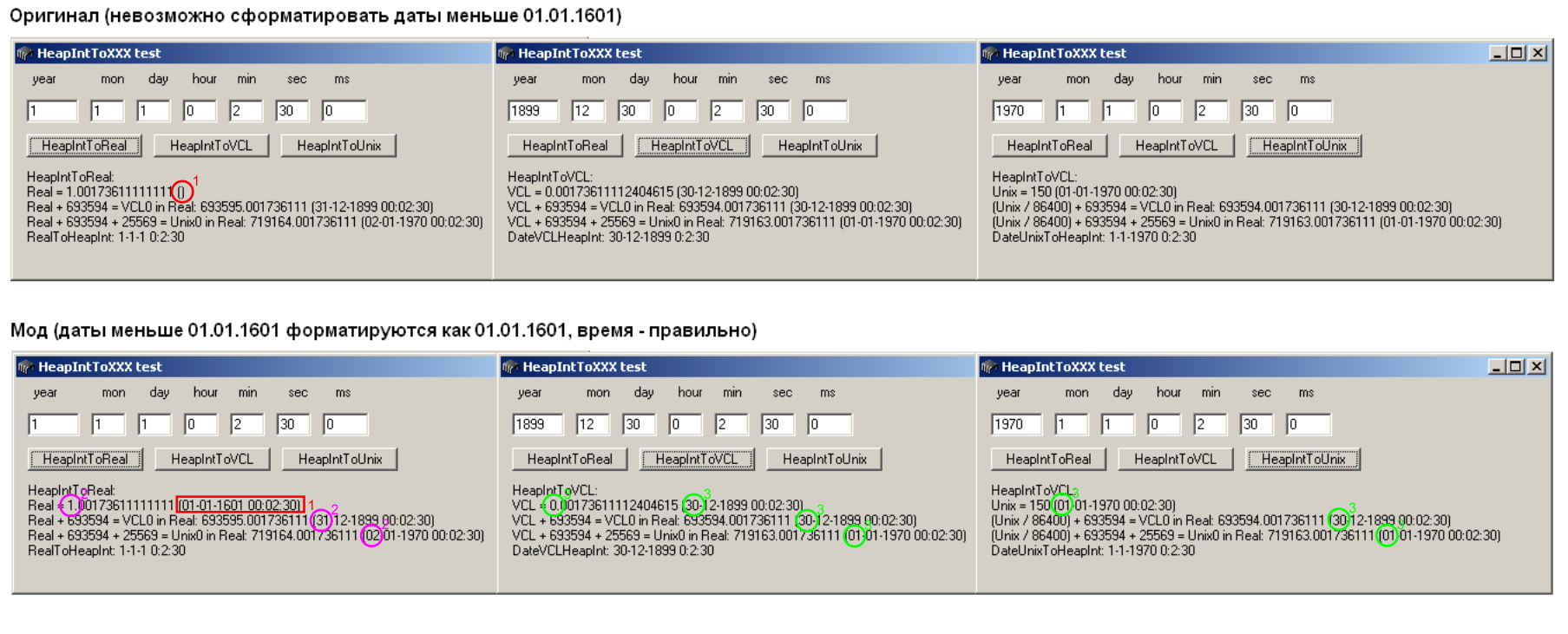 3) Для HeapIntToDateUnix используется одна и та же функция, что и для DateReal. Она выдаёт результат в DateReal, затем конвертирует его в DateUnix. В приведенном на скриншоте примере результат соответствует примерно 01.01.0001 00:02:30. А эту дату нельзя представить в 32-битном формате Unix, поэтому результат согласно п.2. Почему примерно 01.01.0001? Потому что, хоть в DateReal 0-вая дата заявлена 01.01.0001, но установка год-месяц-день равными 1 (01.01.0001) даёт в результате DateReal=1.0 - то-есть, прошел один день от какой-то даты. Может быть и ошибка в работе функции SystemTime2DateTime. Выходом может быть уменьшение на 1 номера дня при HeapIntToDateReal. Обсуждение - ниже.