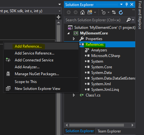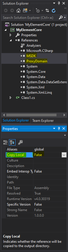 Чтобы «разговаривать» с конструктором на одном языке, элементу надо указать где находятся две сборки конструктора, в которых хранится код классов общения со средой. Воспользуемся панелью обозревателя решения (Solution Explorer) и укажем на файлы конструктора MSDK.dll и ProxyDomain.dll в папке C:\HiAsm.NET\: