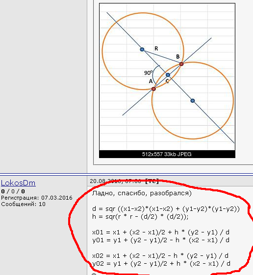 потратили не больше пяти минут1. Вводим в поисковик: "позиция центра окружности по двум точкам и радиусу".