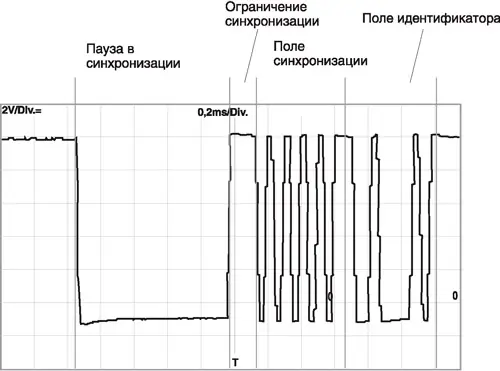 Эта часть передается рецессивным уровнем (около 12 В), что соответствует передаче "единицы" и сообщает блокам LIN Slave о том, что пауза закончилась и необходимо приготовиться к синхронизации.