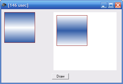Слева отрисовка прямо на форме (Handle), справа -- на PaintBox'e (Bitmap) Режим прямоугольного градиента готов полностью, остался треугольный. В данном компоненте применяется API-функция GradientFill, откуда и такое быстродействие. |