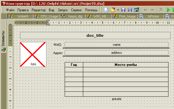 Очевидно, что тут doc_title, name и address это имена новых элементов для вывода текста, содержимое которых задается программно. foto - это имя элемента Image, в который программно будет загружена фотография |