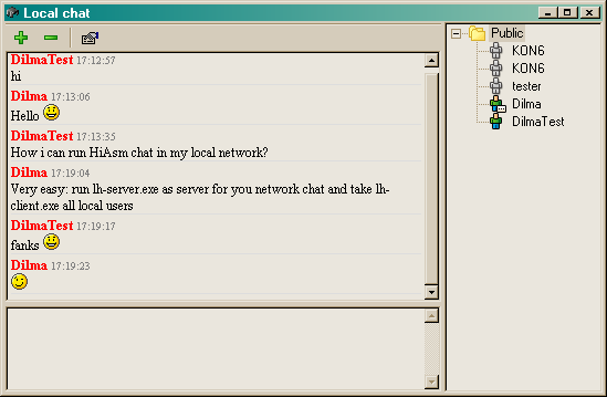 В аттачах к сообщению можно найти исходники чата hiasm_lh_chat.rar(только для последнего HiAsm со всеми обновлениями по SVN) и собранные версии hiasm_lh_chat_bin.rar.