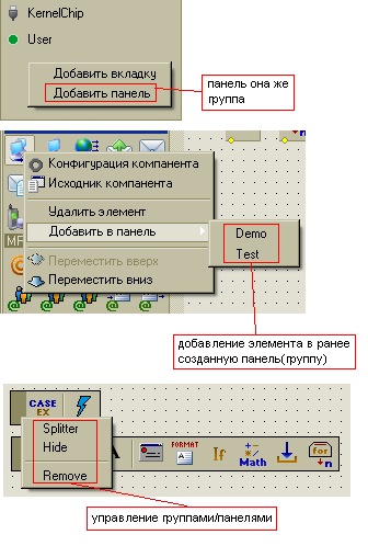 Dilma писал(а): очевидно, что ожидаются мнения по существуДавай по-существу. А не лучше было сделать, наряду с компонентами, группы, плюс общую группу (кучу), с которой и начинался бы вывод панели, а в группах можно было выбирать наиболее часто используемые компоненты. Кликнул по группе, и она раскрылась бы, заменив собой предыдущую панель. В таком случае, панель бы состояла из двух уровней: верхняя -- с компонентами и нижняя -- с группами. И все это можно было бы выбирать и настраивать с возможностью сохранения и загрузки после обновления среды (как меню) |