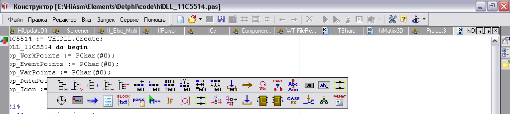 Создаем проект, например Приложение Windows, или любое другое в котором есть панель быстрых элементов, сворачиваем HiAsm, открываем папку code(любого пакета), и жмем на текстовом файле(pas,hws...) с кодом компонента ПКМ, в меню выбираем открыть с помощью... с помощью HiAsm, раскрываем HiAsm, код открыт, вкладка с файлом есть, а панель... осталась