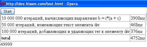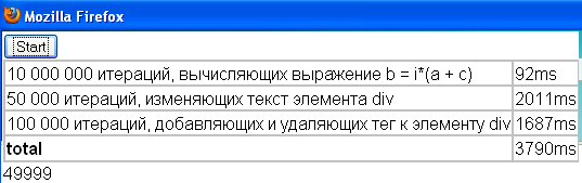 50 000 итераций, изменяющих текст элемента div 556ms 100 000 итераций, добавляющих и удаляющих тег к элементу div 404ms total 1115ms 49999 intel(r) pentium(r) m processor 1.73 mhz |