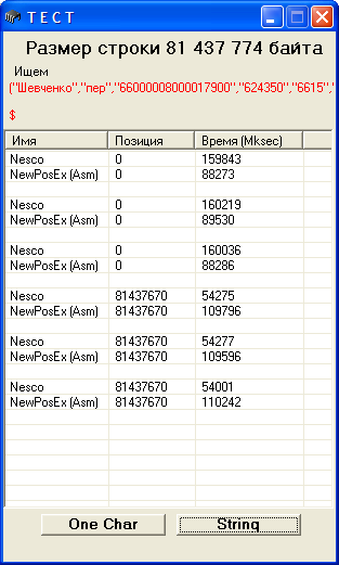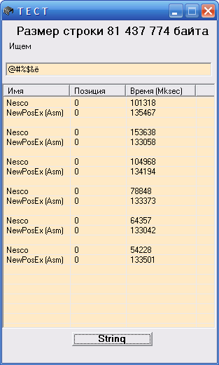 Давай договоримся в Form.Caption ложишь номер теста. Вот моя картинка (если задать несуществующее слово, то Result= -1 ) ------------ Дoбавленo в 17.06: Позиция на 1 меньше, а время больше |