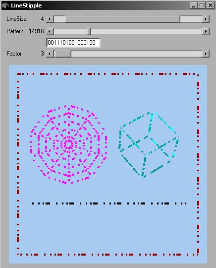 Pattern – это целое число которое определено как 16-битная серия из нулей и единиц, определяющая, как будет рисоваться отрезок (пример: 0000 1111 0000 1111). Она повторяется по необходимости для шаблонирования всего отрезка. Единица означает, что соответствующая точка отрезка будет нарисована на экране, ноль означает, что точка нарисована, не будет (на попиксельной основе). Шаблон применяется, начиная с младшего бита (справа налево).