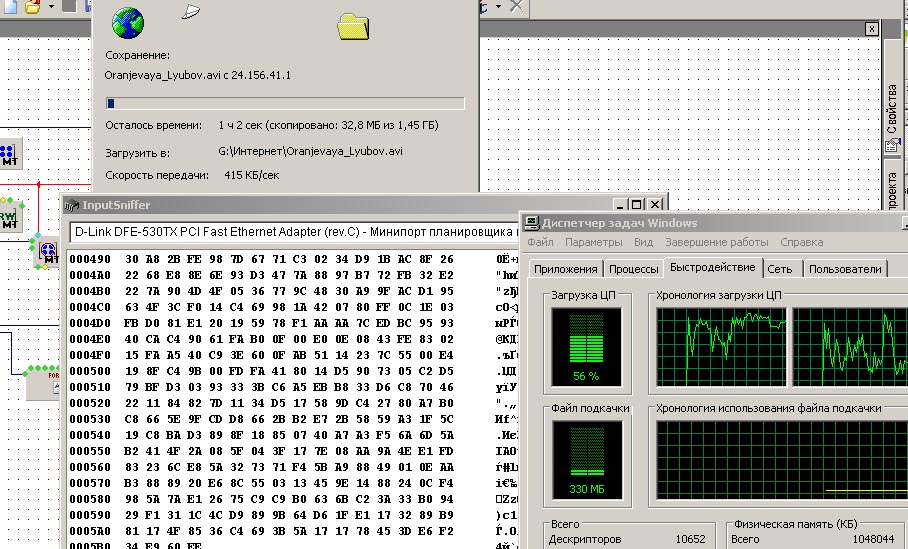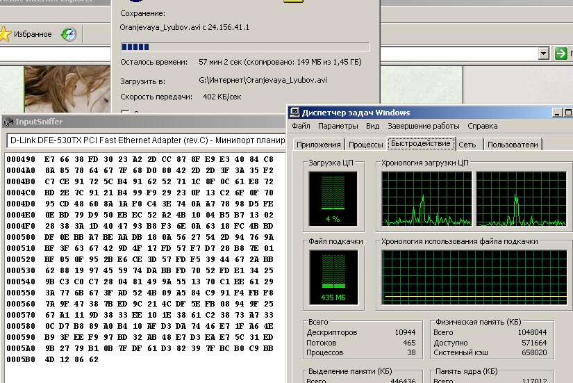 nesco, мне, пользователю, такой компонент не нужен, очень процессор грузит (на рисунках включено/отключено - для проверки зашёл на видеосервер, ткнул какой-то фильм на закачку), нужнее маленькое окошко "Принято *** байт. Отослано *** байт. Текущая скорость *** байт/сек"