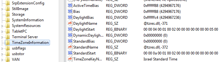 Вот цитата из книги Питера Хипсона "Реестр Windows XP": Разделы TimeZoneInformation (HKEY_LOCAL_MACHINESYSTEMControlSet001ControlTimeZoneInformation), (HKEY_LOCAL_MACHINESYSTEMControlSet002ControlTimeZoneInformation), (HKEY_LOCAL_MACHINESYSTEMCurrentControlSetControlTimeZoneInformation) содержат информацию о часовых поясах и летнем времени. Для его заполнения используются даные таблицы часовых поясов из раздела [HKEY_LOCAL_MACHINESOFTWAREMicrosoftWindows NTCurrentVersionTime Zones] Раздел содержит следующие параметры: ActiveTimeBias - смещение местного времени в минутах от Гринвича с учётом летнего времени. Чтобы определить смещение в часах, достаточно разделить это значение на 60; Bias - номинальное смещение местного времени в минутах от Гринвича бз учёта летнего времени. Смещение в часах определяется делением на 60; DaylightBias - разность между Bias и ActiveTimeBias при действии летнего времени; DaylightName - название часового пояса при активном летнем времени DaylightStart - структура SYSTEMTIME с информацией о начале действия летнего времени; StandardBias - разность между Bias и ActiveTimeBias без действия летнего времени. Значение обычно равно нулю; StandardName - название часового пояса без действия летнего времени; StandardStart - структура SYSTEMTIME с информацией о конце действия летнего времени; |