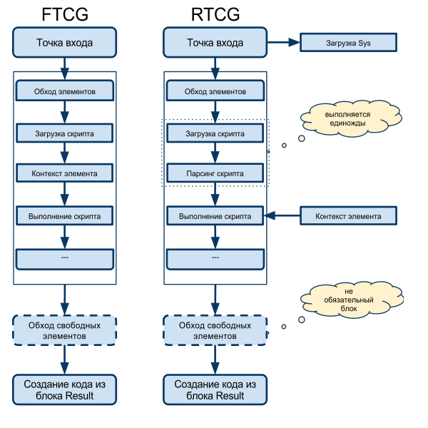 - Выполнение скрипта - в FTCG выполнение скрипта совмещено с парсингом и выполняется для каждого метода каждого элемента при каждом вызове, в RTCG выполняется байт код, полученный на предыдущем шаге