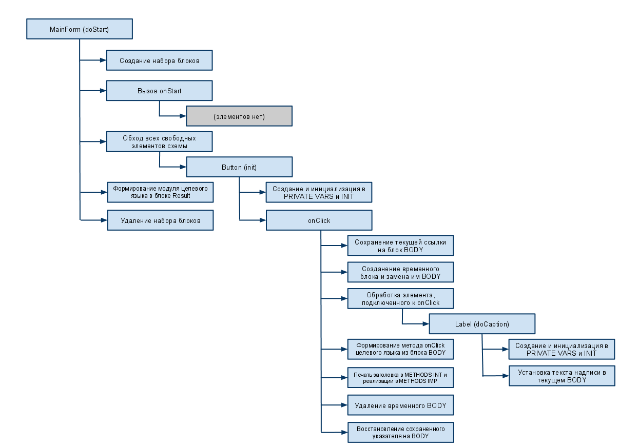 Текущий блок это тот сегмент кода в конечном приложении, который выполняет основную работу программы и в зависимости от того, в какой "событийной" ветки схемы находится элемент, обрабатываемый кодогенератором в данный момент, этот блок может ссылаться на разные участки кода. Посмотрим на примере как это происходит.