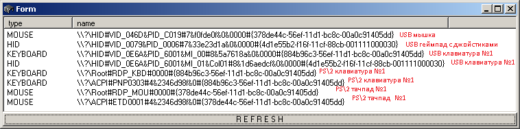 ------------ Дoбавленo в 21.52: Ivann писал(а): Есть только мыши и клавиатурыДа нет, всякие джойстики тожедолжны быть, всё, что не клавиатура и мышка, должно быть "HID". А уже внутри HID своя классификация (там сотни устройств). Главное получить все данные, потом поразбираться и поклассифицировать могу попробовать. А пока пойду решать проблему с клавиатурой и мышью по WOW64 на NT6.x. |