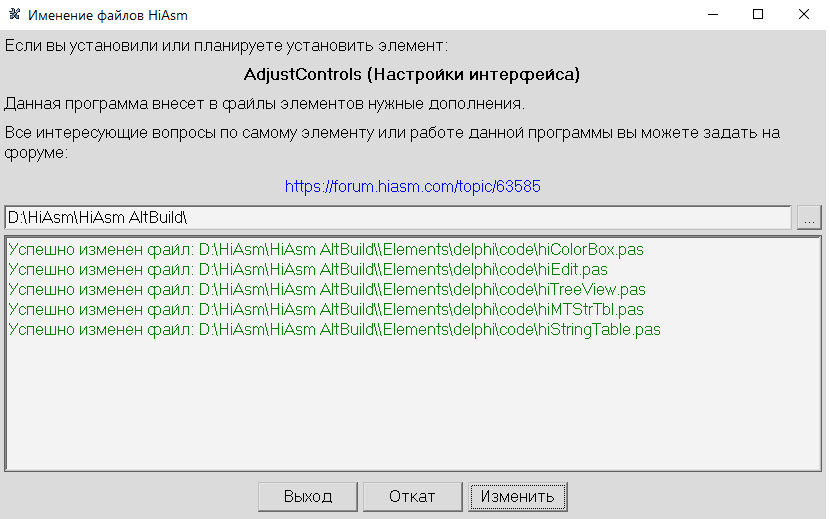 1. Редакторы ParametersList и NameList для получения имен интерфейсных элементов вынуждены выделять все элементы на поле HiAsm и копировать. В результате после закрытия редактора свойств остается выделенными все элементы на поле HiAsm, а не один элемент AdjustControls. (После выхода из редактора достаточно кликнуть мышью на пустое поле HiAsm и снова выбрать элемент).