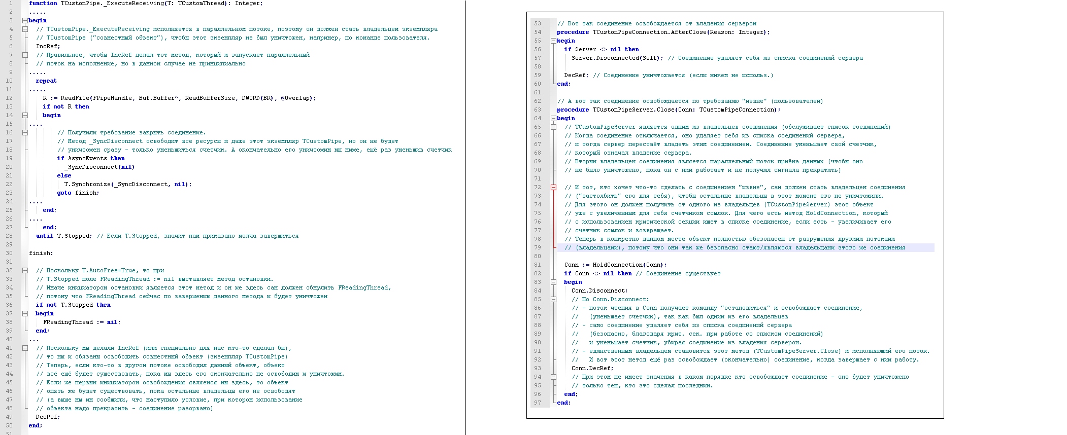 Он, выйдя из "вечного цикла", устанавливает Event на закрытие другого потока. Который, в свою очередь выйдя из "вечного цикла", убивает файл (CloseHandle(hFile)). Позволю себе сформулировать общий принцип проще: Если некоторый объект используется несколькими потоками, то (при поставленой задаче неблокирующего взаимодействия потоков) уничтожением этого объекта должен заниматься тот, кто последний решил его уничтожить. Эта задача не решается с помощью критических секций - так как таким "общим объектом" будет являться сама критическая секция, кроме того она является источником блокировок. Решается же эта задача путём реализации в таком общем объекте механизма подсчета ссылок. Озвучу термины: - "освобождение объекта" - в привычных нам методах программирования - вызов Free/Destroy. В случае совместного доступа нескольких потоков вызов Destroy одним потоком недопустим, пока этот объект используется в других потоках. В контексте объекта с подсчетом ссылок - уменьшение счетчика ссылок, который, достигнув 0 уничтожит объект по Destroy. - "владелец объекта" - объект (или поток), метод которого отвечает за уменьшение счетчика ссылок совместного объекта (освобождение). Первым владельцем объекта становится тот, кто его создаёт - тут других вариантов нет. Он может передать этот объект во владение кому-то другому, затем сразу же забыть о его существовании (так как новый владелец будет отвечать за уничтожение нашего объекта и может его уничтожить). Если же владелец хочет использовать объект одновременно с другими потоками, то только владелец может передать его кому-то другому, предварительно увеличив счетчик использования объекта. Таким образом владелец получает гарантию, что совместный объект не будет уничтожен ни одним из владельцев, пока каждый владелец заинтересован в его существовании. В Pipe-сервере это выглядит так: Ну, а CloseHandle(hFile) по идее прерывает WaitForSingleObject, и последующие функции работы с этим хендлом показывают соответствующую ошибку - достаточно правильно обработать. Редактировалось 1 раз(а), последний 2017-05-25 10:48:25 |