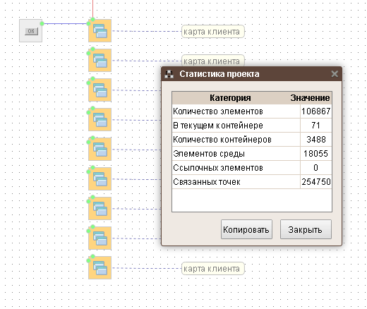 Что касается быстродействия: копирование указанного куска в схеме происходит очень долго и его окончания я ни разу не дождался в виду падения с ошибкой, но одна лишь эта форма: копируется около двух минут. С этим вероятно тоже что-либо сделать можно, т.к. основные тормоза происходят из-за того, что внутренности каждой схемы выделяются после вставки и срабатывает цепочка тригеров, которые обновляют состояние GUI (панель свойств, дерево элементов, состояние всех команд и т.д.) из-за чего время катастрофически растягивается. И наконец попробовал открыть схему в Hion: Открывается конечно же дольше, чем в HiAsm - примерно пол минуты. Зато выделенный кусок схемы копируется примерно за 4 секунды и соответственно никаких падений вкладки браузера нет, 100 000 элементов держит без проблем: Очевидно, что тут все ограничено исключительно объемом памяти, доступной браузеру. Редактировалось 1 раз(а), последний 2016-12-14 14:53:02 |