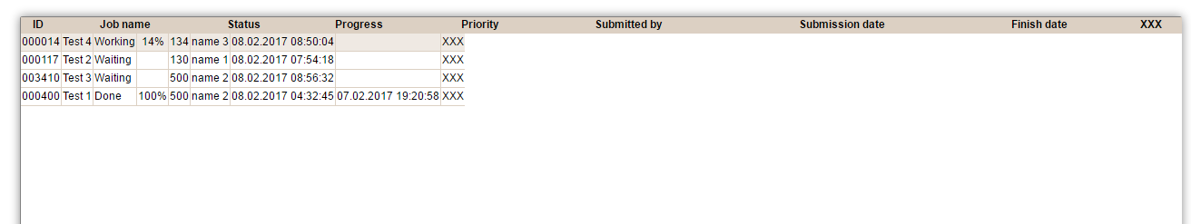 Columns=#382:[{"title":"ID","width":"80"},{"title":"Job name","width":"140"},{"title":"Status","width":"120"},{"title":"Progress","width":"80","align":"center"},{"title":"Priority","align":"center","width":"80"},{"title":"Submitted by","width":"100"},{"title":"Submission date","width":"140","align":"center"},{"title":"Finish date","width":"140","align":"center"},{"title":"XXX","width":"140"}]|