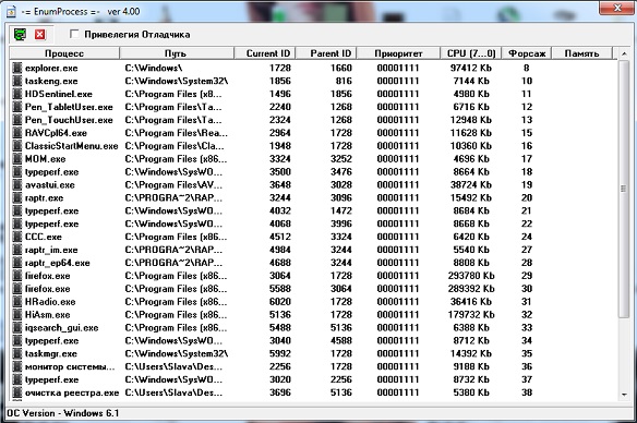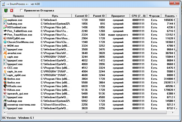 Columns=#21: Процесс=145|21: Путь=150|15: Current ID===1|15: Parent ID===1|16:Приоритет=110==2|17:CPU (7...0)=80==2|12:Форсаж=65==2|15:Память =80==1|