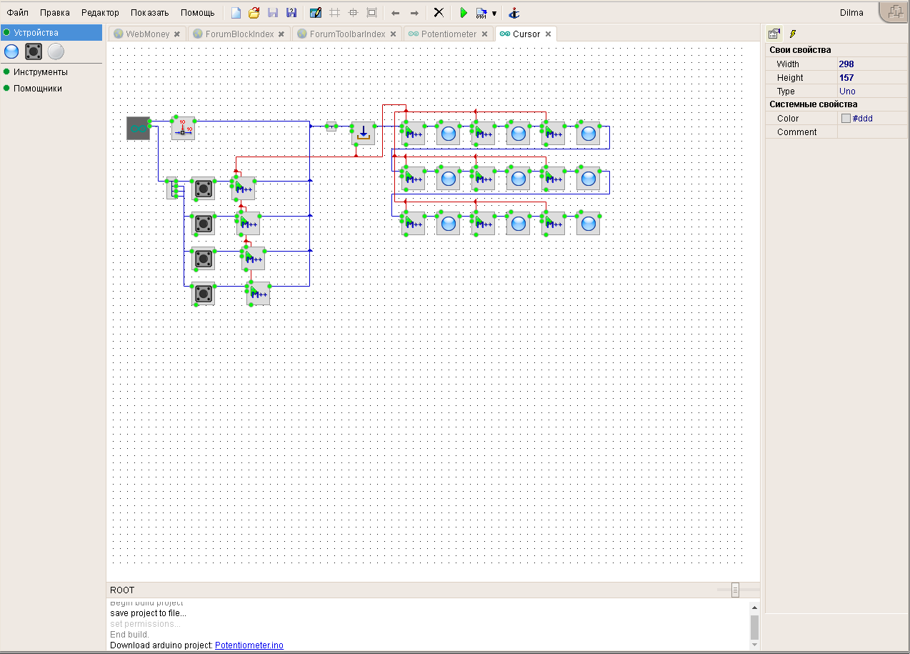 Данный пакет не является полноценным инструментом создания прошивок(скетчей) для плат Arduino и служит лишь в качестве демонстрации. В пакете находятся всего несколько специализированных элементов, демонстрирующих общий подход к его архитектуре. На вкладке Устройства представлены самые простые датчики и элементы управления, которые можно подключить к портам платы. С их помощью можно составить небольшие рабочие схемы и проверить их работу как в эмуляторе так и на плате что называется "в живую". Примеры скетчей можно найти в папке Examples/arduino.