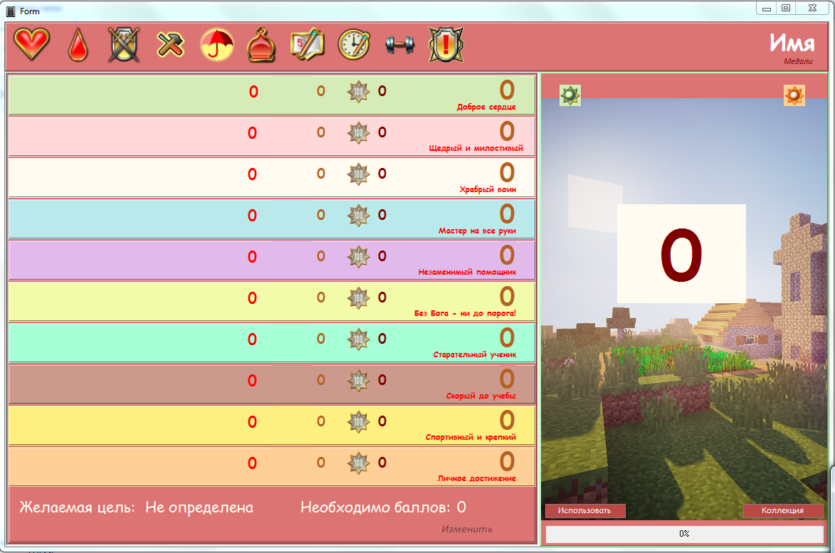 задать имя ребенка, указать цель, необходимое количество баллов и установить другую картинку