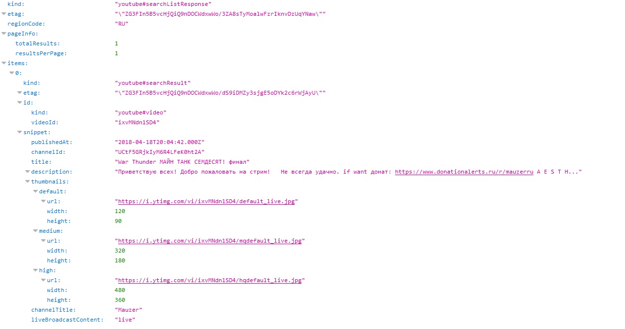 Я вынес мозг доброй половине программистов на "тостере" и "киберфоруме" в итоге решение мне помог найти человек который уже не раз спасал меня в плане программирования! За что ему огромное спасибо! Ты мега крут!!!! ))) И так запрос на наличие стрима/онлайна канала на ютуб выглядит следующим образом: https://www.googleapis.com/youtube/v3/search?part=snippet&channelId=ИД_КАНАЛА&eventType=live&maxResults=1&order=date&type=video&key=ВАШ API КЛЮЧЬ Если стрим присутствует то ответ будет выглядеть так: Если нет ни стрима ни оповещения о нем, то раздел: items будет пустым Всё что я хотел получить от API youtube, я получил. Теперь дело за малым собрать все это в схему и по возможности запилить компонент. ))) |