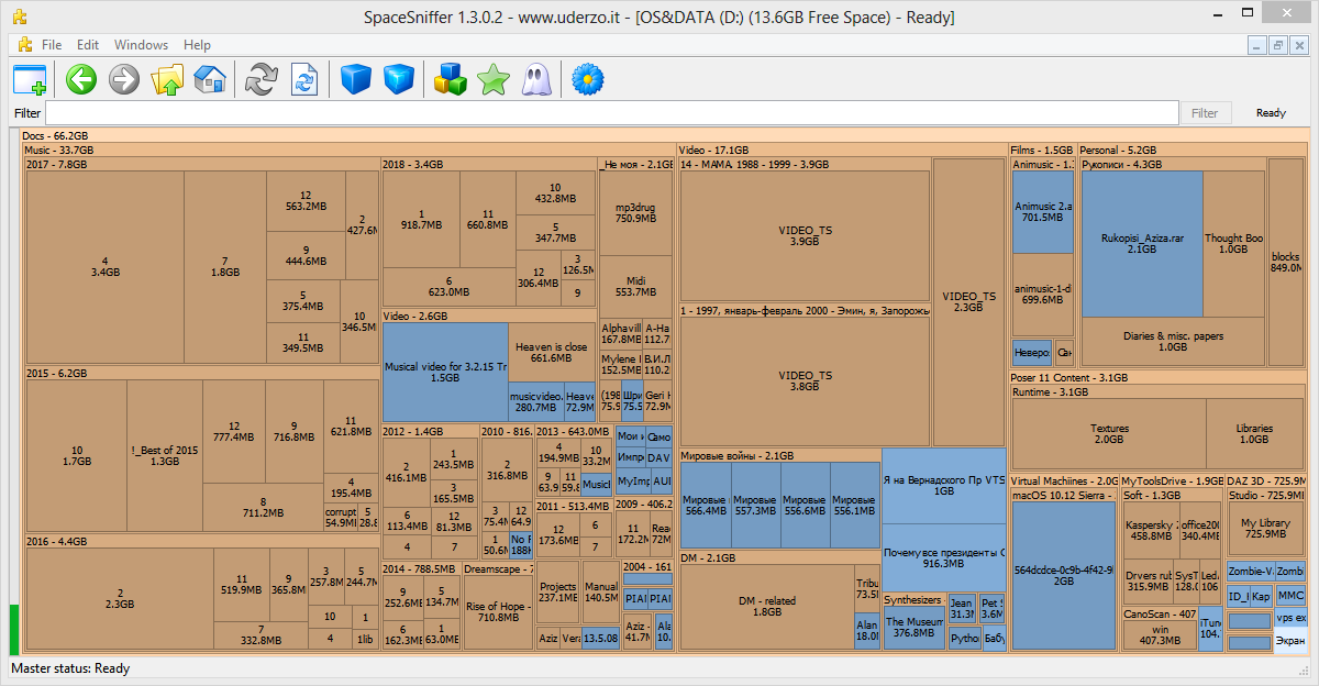Есть такая классная и полезная прога - Space Sniffer, очень выручает когда место на диске кончается, она строит карту с размерами всех файлов и визуально сразу видно куда ушло место на диске: