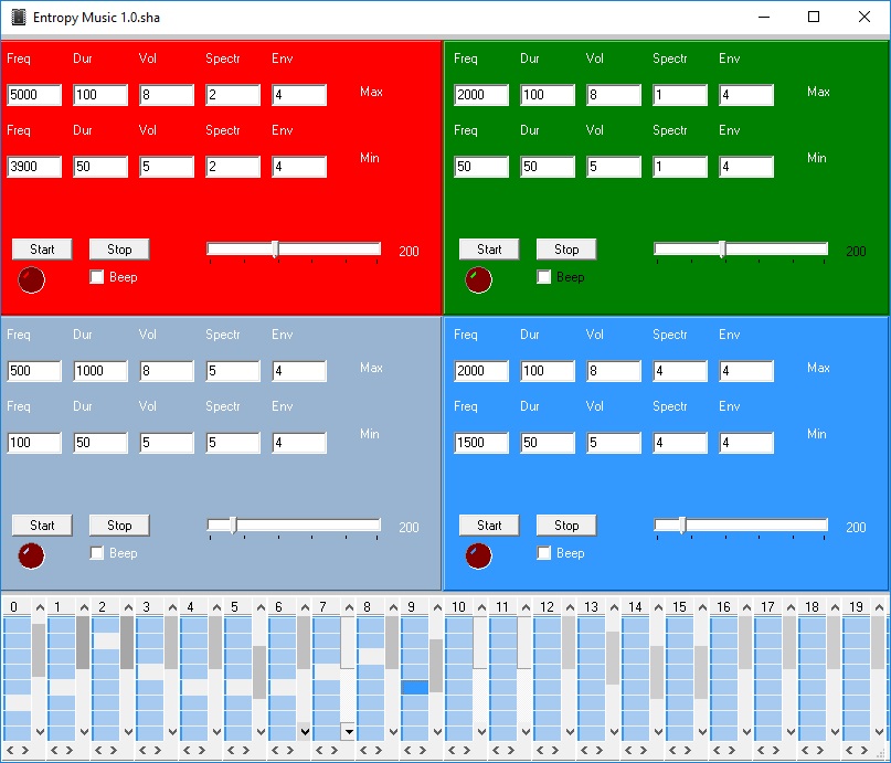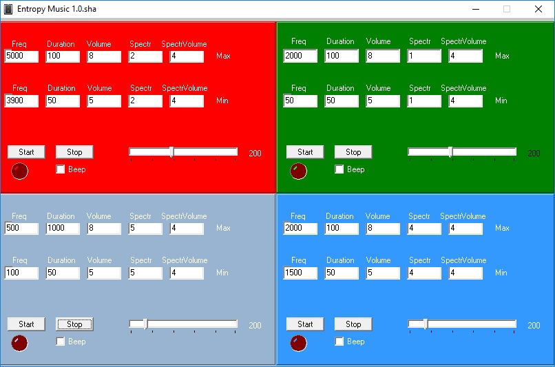 В полях ввода задаются максимальные и минимальные значения для генератора случайных чисел для каждого генератора звука. В силу специфики компонента, генераторы (видимо используется монопольный доступ к звуковой карте) ИГРАЮТ ПОСЛЕДОВАТЕЛЬНО. Если кто поможет преодолеть это ограничение, будет вообще здорово. В компоненте Sound можно подправить одну переменнную для того чтобы выводился стереозвук.