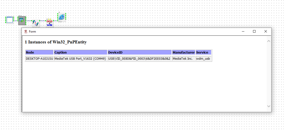zhorik5,пример из проекта со схожей задачей.  пример Add(MainForm,13529263,119,63) { Width=509 Height=194 Caption="ARDUINO ВАХ" Position=1 Point(Close) Point(onClose) Point(Left) Point(Top) link(onCreate,7868981:doEvent1,[]) link(onClose,4796282:doWork1,[(319,90)]) } Add(EnumCOM,15522172,385,119) { link(onEnumPorts,15071772:doModify,[]) } Add(ComboBox,529092,553,119) { Left=40 Top=45 Width=80 Height=21 Font=[Arial,10,0,0,204] Hint="Выберите порт" Strings=#1: | Text="" DataType=1 ReadOnly=0 Point(onSelect) Point(doSelect) Point(doEnabled) Point(doSelectString) link(onClick,775639:doWork2,[]) link(onSelect,11745743:doWork2,[]) } Add(StrCase,15071772,448,119) { Type=1 link(onModify,529092:doAdd,[]) } Add(Button,1842072,273,238) { Left=15 Top=110 Width=105 Height=30 Font=[Arial,9,0,0,204] Enabled=1 Hint="Закрыть порт" Caption="Закрыть порт" Data=Real(0) Point(doEnabled) link(onClick,4796282:doWork2,[]) } Add(Button,13336586,273,182) { Left=15 Top=75 Width=105 Height=30 Font=[Arial,9,0,0,204] Hint="Открыть порт" Caption="Открыть порт" Data=Real(0) Point(doEnabled) link(onClick,2634306:doWork1,[(333,188)(333,237)]) } Add(COMEX,2365950,497,231) { BaudRate=19 link(onSyncRead,15624878:doValue,[]) link(Port,11045639:Var1,[(503,224)(629,224)]) } Add(Button,1574390,273,126) { Left=15 Top=10 Width=105 Height=30 Font=[Arial,9,0,0,204] Hint="Поиск порта" Caption="Поиск порта" Data=Real(0) Point(doEnabled) link(onClick,7868981:doEvent2,[(331,132)(331,90)]) } Add(Hub,7868981,343,77) { InCount=2 OutCount=4 link(onEvent1,529092:doClear,[(491,83)(491,132)]) link(onEvent2,11045639:doWork1,[]) link(onEvent3,15522172:doEnumPorts,[(371,97)(371,125)]) link(onEvent4,543924:doData,[(427,104)(427,167)]) } Add(StyleXP,11046345,119,182) { } Add(MultiElement,11045639,623,84) { link(onEvent1,6267470:doText,[]) link(onEvent2,13651087:doInit,[(678,97)(678,160)]) } BEGIN_SDK Add(EditMulti,12397613,14,7) { EventCount=2 WorkCount=2 VarCount=1 Width=626 Height=270 VOffset=35 HOffset=203 link(doWork1,2143542:doEvent1,[]) link(doWork2,10037002:doSeparateMT,[(35,55)(35,132)]) link(Var1,8128946:Value,[(223,242)(258,242)]) } Add(DeviceInfo,9938011,126,63) { link(onEnumDevice,10515647:doSeparateMT,[]) } Add(MT_MultiData,10515647,175,63) { Count=4 link(onData4,15435401:doCompare,[]) } Add(StrMask,15435401,231,84) { Mask="*(COM*" link(onTrue,11133217:doEvent1,[]) AddHint(-15,-26,50,13,Mask) } Add(StrList,1885082,336,35) { } Add(Hub,2143542,56,42) { OutCount=4 link(onEvent1,1885082:doClear,[]) link(onEvent2,16087229:doClear,[(315,55)(315,90)]) link(onEvent3,9938011:doEnumDevice,[(109,62)(109,69)]) link(onEvent4,11952724:doData,[(82,69)(82,230)]) } Add(ArrayEnum,5007696,350,182) { link(onItem,12486983:doCompare,[(387,188)(387,132)]) link(Array,1885082:Array,[]) } Add(StrMask,12486983,399,126) { Point(doMask) link(onTrue,6594612:doEvent1,[]) } Add(FormatStr,16018755,203,133) { DataCount=1 Mask="*%1*" Point(FString) link(onFString,5399840:doEvent1,[]) } Add(Hub,5399840,273,133) { link(onEvent1,12486983:doMask,[]) link(onEvent2,5007696:doEnum,[(306,146)(306,188)]) } Add(Hub,6594612,441,133) { link(onEvent1,5007696:doStop,[(477,139)(477,167)(316,167)(316,195)]) link(onEvent2,12397613:onEvent1,[(468,146)(468,48)]) } Add(Delete,11250590,203,182) { Count=3 link(onDelete,8128946:doValue,[]) } Add(Memory,8128946,252,182) { } Add(MT_MultiData,10037002,98,126) { link(onData1,10022025:doEvent1,[]) } Add(Hub,10022025,147,126) { link(onEvent1,11250590:doDelete,[(176,132)(176,188)]) link(onEvent2,16018755:doString,[]) } Add(Hub,11133217,273,91) { link(onEvent1,1885082:doAdd,[(301,97)(301,41)]) link(onEvent2,6937890:doString,[(393,104)(393,83)]) } Add(FormatStr,6937890,420,77) { Mask="%1\r\n" link(onFString,5567455:doReplace,[]) } Add(StrCat,16087229,539,77) { Point(doClear) link(Str1,11117897:Var3,[(545,65)(591,65)(591,128)]) } Add(DoData,11952724,539,224) { link(onEventData,12397613:onEvent2,[(612,230)(612,55)]) link(Data,11117897:Var2,[]) } Add(GetDataEx,11117897,539,123) { link(Data,16087229:Result,[]) } Add(Replace,5567455,483,77) { SubStr="Порты (COM и LPT)" link(onReplace,16087229:doStrCat,[]) } END_SDK Add(DoData,543924,448,161) { Data=Integer(0) link(onEventData,529092:doSelect,[(492,167)(492,153)]) } Add(HubEx,4796282,315,238) { link(onEvent,2634306:doWork2,[]) } Add(HubEx,775639,602,126) { Angle=3 link(onEvent,11045639:doWork2,[(606,97)]) } Add(MultiElement,2634306,350,231) { link(onEvent1,2365950:doOpen,[]) link(onEvent2,2365950:doClose,[]) link(onEvent3,15518621:In,[]) link(onEvent4,607208:In,[]) link(onEvent5,14716941:In,[]) link(onEvent6,3999535:In,[]) link(onEvent7,15044237:In,[]) } BEGIN_SDK Add(EditMulti,13051276,21,21) { EventCount=7 WorkCount=2 Width=209 Height=116 VOffset=35 link(doWork1,6616624:doEvent1,[(42,62)(42,41)]) link(doWork2,570273:doEvent1,[]) } Add(ChanelToIndex,14556147,98,70) { link(onIndex,4451736:doSet,[]) } Add(Hub,570273,56,63) { link(onEvent1,13051276:onEvent2,[]) link(onEvent2,14556147:doWork1,[]) } Add(Hub,6616624,56,35) { link(onEvent1,13051276:onEvent1,[(96,41)(96,62)]) link(onEvent2,14556147:doWork2,[(88,48)(88,83)]) } Add(MultiSetParam,4451736,147,70) { Parameters=#4:0;1 |3:1;0| Count=2 link(onSet1,13051276:onEvent3,[]) link(onSet2,1688797:doEvent1,[]) } Add(Hub,1688797,196,77) { OutCount=4 link(onEvent1,13051276:onEvent4,[]) link(onEvent2,13051276:onEvent5,[]) link(onEvent3,13051276:onEvent6,[]) link(onEvent4,13051276:onEvent7,[]) } END_SDK Add(LineBreak,835938,231,126) { Caption="+-" link(Out,1574390:doEnabled,[]) Primary=[607208,203,126] } Add(LineBreak,10327543,231,182) { Caption="+-" link(Out,13336586:doEnabled,[]) Primary=[14716941,175,77] } Add(LineBreak,2310551,231,238) { Caption="+-" link(Out,1842072:doEnabled,[]) Primary=[15518621,175,7] } Add(LineBreak,4457274,504,154) { Caption="+-" link(Out,529092:doEnabled,[]) Primary=[3999535,-70,112] } Add(Memory,15624878,644,245) { } Ad