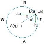 Vandjer, на рисунке не земной шар, но карта местности, где А -- точка от которой идёт отсчёт, а В -- искомая точка, находящаяся на расстоянии R от А по направлению с углом α от параллели.