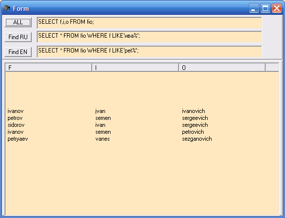 Есть таблица FIO в базе. Поля: Фам, Имя, Отч, Адрес Выбрать * из FIO только женщин с фамилией начинающейся на "И" именем "Ал%" и проживающие на "%Победы%" Примерно так: |