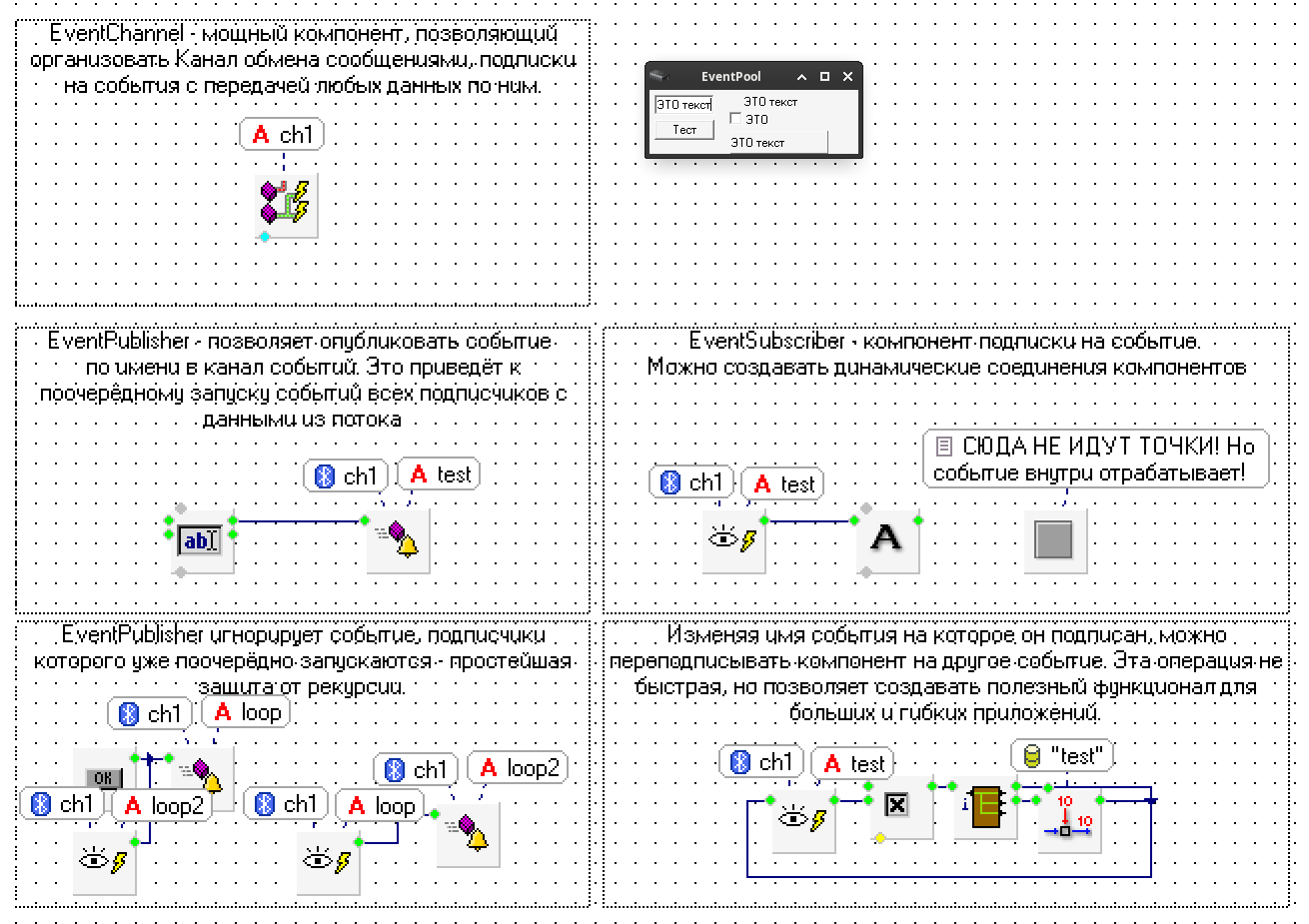 - Удобство разработки. Не нужно в больших схемах тащить линии через кучу контейнеров в другую кучу контейнеров - вызовите соответствующиее событие.