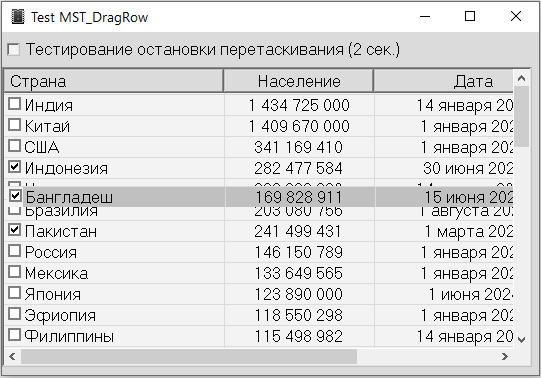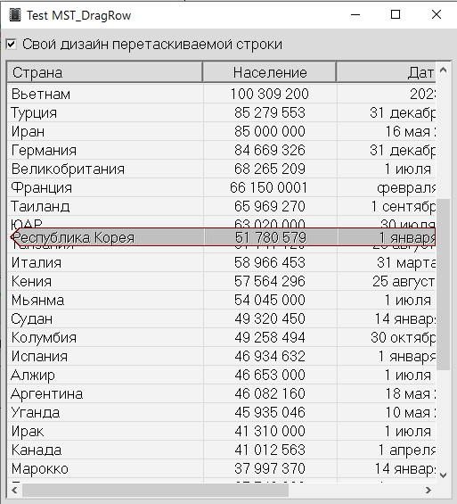 Элемент MST_DragRow предназначен для перетаскивания выбранной строки курсором (зажатой левой клавишей мыши) в таблице строк MTStrTbl (вкладка Интерфейс 2, туда же и устанавливается по умолчанию). Работает как и все остальные элементы этой группы как менеджер и не требует каких либо настроек, достаточно подключить к таблице (свойство MSTControl). Точки в элементе все спрятаны, так как в большинстве случаев в них нет надобности. Но при желании можно и запретить перетаскивание определенных строк и отменить его в любой момент, а так же изменить вид перетаскиваемой строки.
