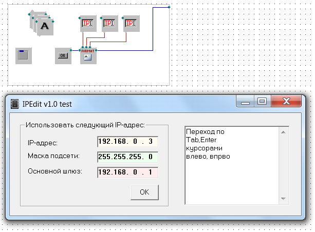 z80 писал(а): Может подскажете еще как реализовать поле ввода для айпи как на картинке?. т е как в виндовс. что бы можно было вводить только цифры и автоматом точки стояли через каждые три цифрыМожно воспользоваться вот этим компонентом https://forum.hiasm.com/topic/65657 Или нарисовать самому |